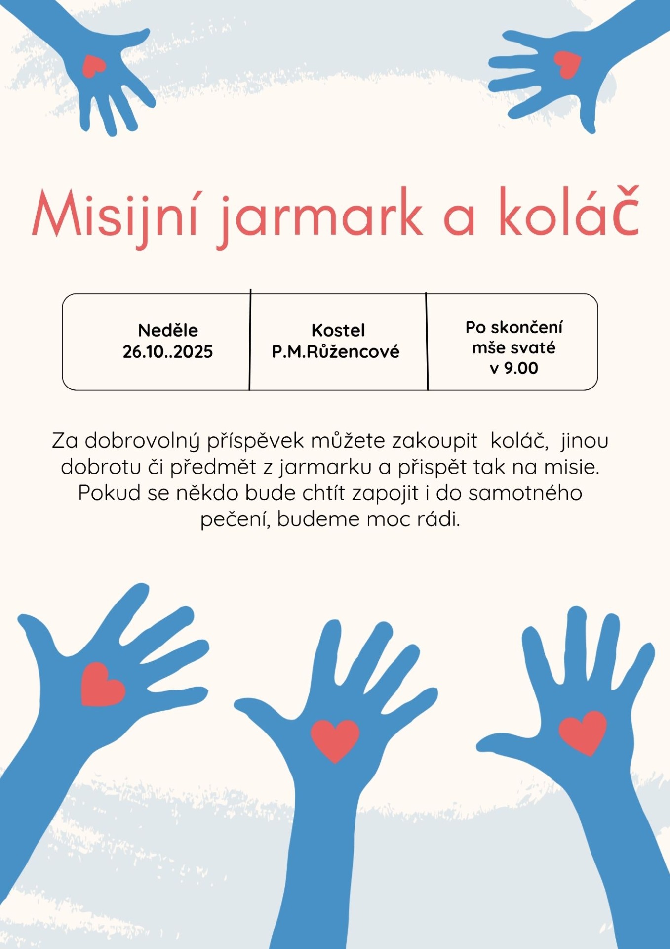 V neděli 26. 10. o slavnosti Posvěcení kostela Panny Marie Růžencové, zveme po mších svatých na misijní jarmark, jehož výtěžek bude věnován na misie, za které jsme se modlili tuto neděli. Nabídne vám misijní kalendář na rok 2026, knihu o apoštolu růžence Bartolo Longovi, který byl tuto neděli svatořečen, pexeso s misijní tématikou. Po mši sv. v 9 h se navíc můžete těšit na misijní koláč :)