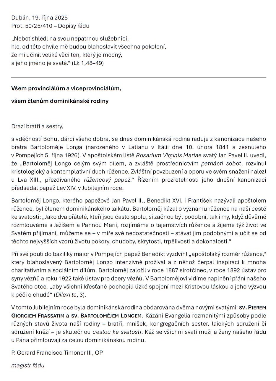 Včera, v neděli 19. 10. svatořečil papež Lev XIV. bl. Bartola Longa, dominikánského laika. Při této příležitosti píše magistr řádu svůj dopis celému řádu. Vzpomínáme na jeho nedávnou návštěvu u nás v Plzni.